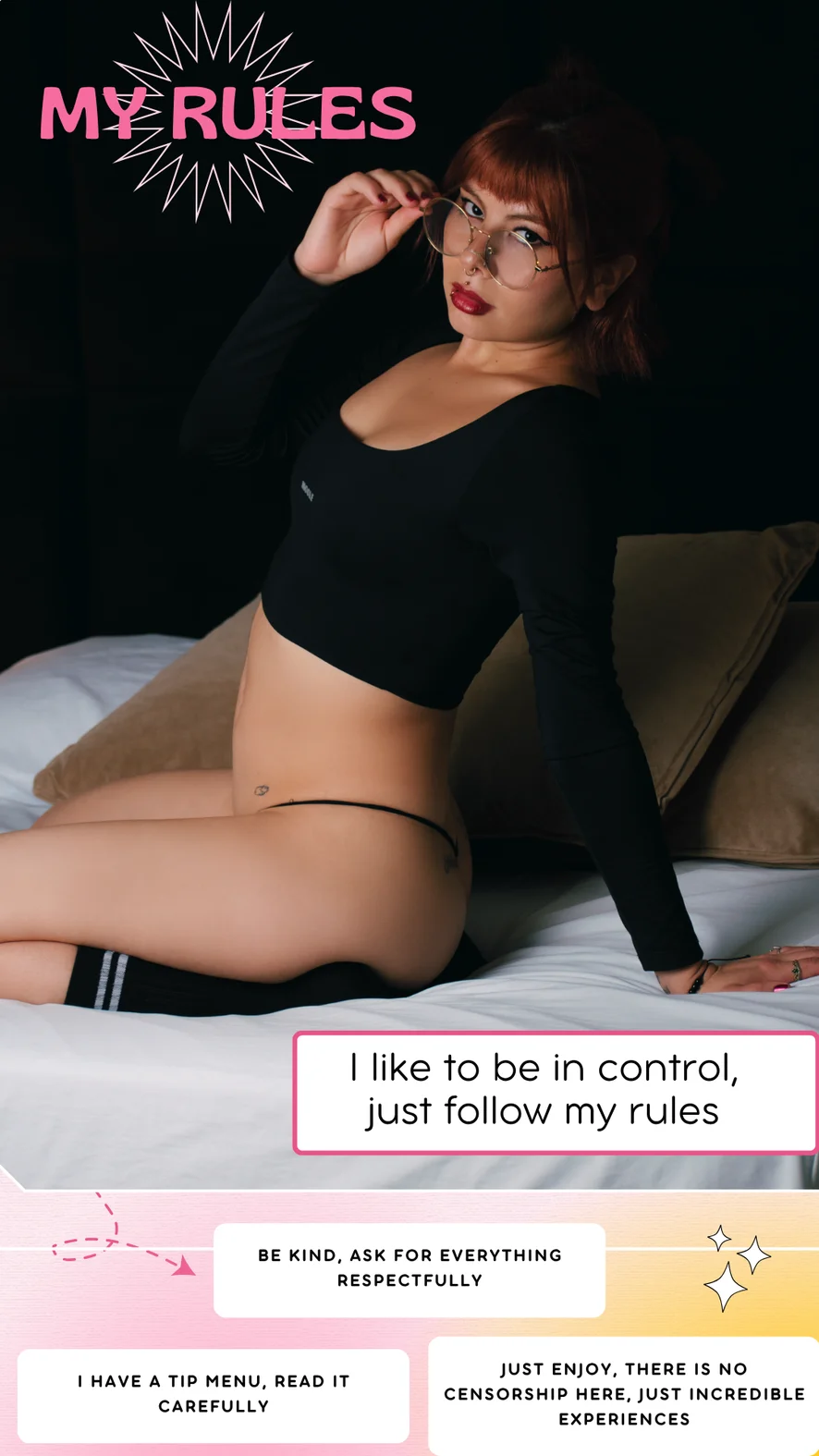 Doggy Style, Eroottinen tanssi, Camel Toe, Korkokengät, Yläosattomissa, Twerkkaus, Selkäsauna, Ahegao, Kalu-luokitus, Sormetus, Dildo tai vibraattori, Tuhmat puheet, Suihinotto, Masturbointi, Cosplay, Strippaus, Facial, Jalkafetissi, Tupakointi, Nöyryytys, Runkkausohjeet, Syväkurkku, Seksilelut, Tissipano, Orgasmi, Jalkaseksi, Squirttaus, Hardcore, Lehmityttö